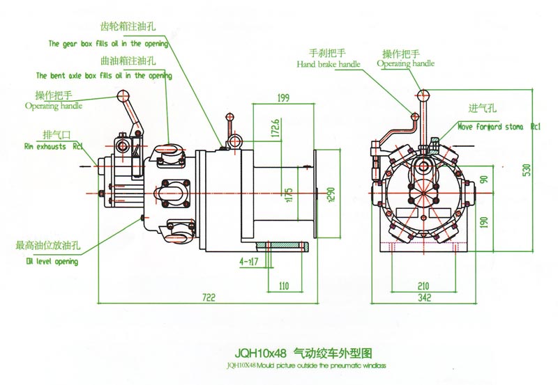 产品简介JQH1Ox48气动绞车.采用压缩空气为动力.推动TMH4A活塞式气动马达工作。再通过二级齿轮减速.把扭矩传给滚筒。 气动绞车的操纵,