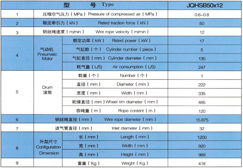 产品简介JQHSB50x12气动绞车.采用压缩空气为动力,推动TMH 17活塞式气动马达工作。再通过二级齿轮减速.把扭矩传给滚筒。 气动绞车的操